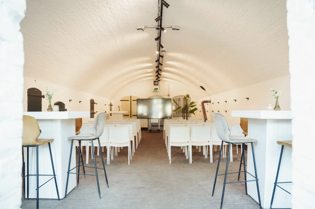 Voor grote internationale kick-offs of bedrijfsjubilea huur je het hele fort af. Alle kazematten, het complete buitenterrein, meerdere podia en bars. Je kunt verschillende zones creëren: VIP-gebied, main stage area, chill zone, workshop zone. Parkeren regelen we op een nabijgelegen veld.